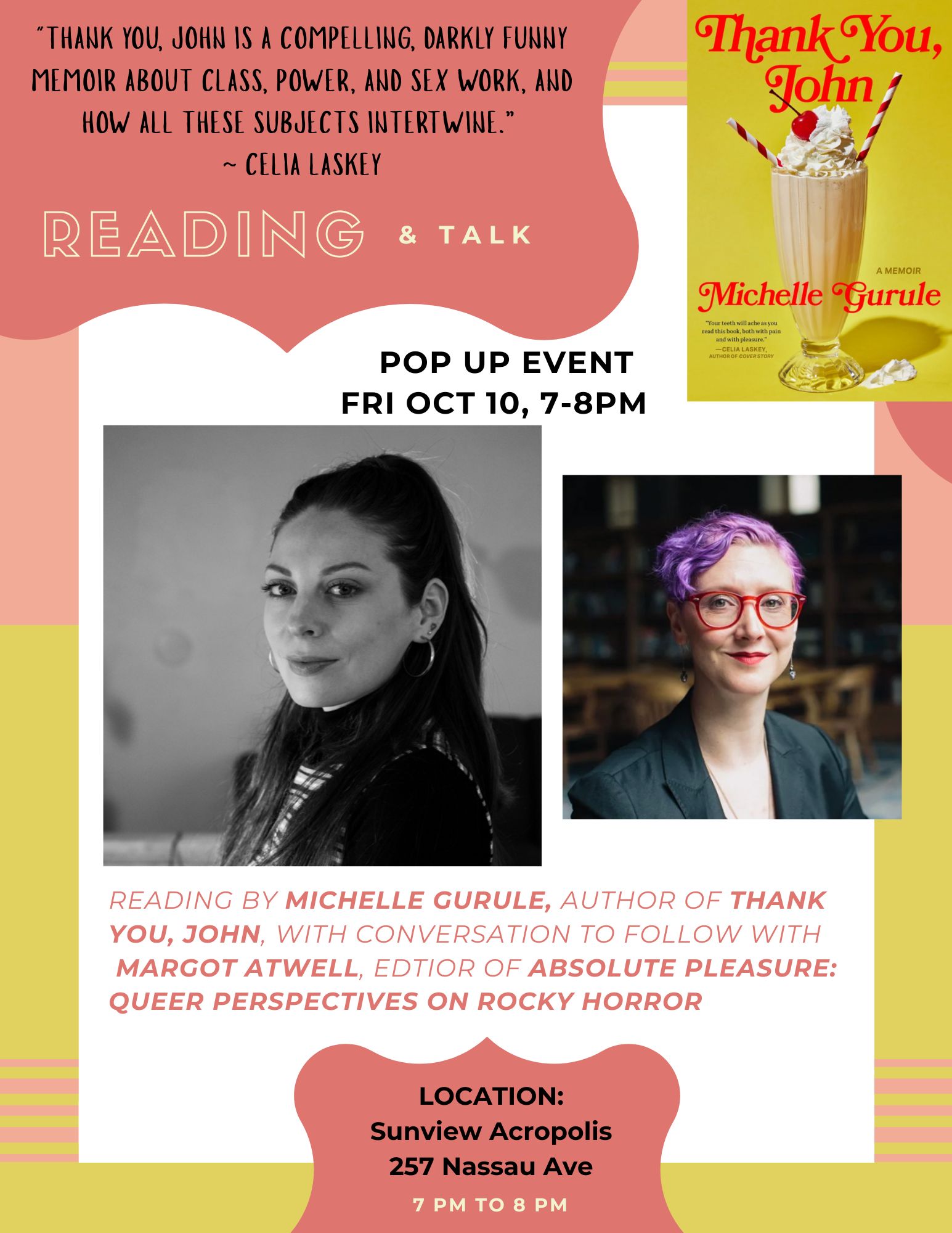 Reading by Michelle Gurule, author of Thank You, John, with conversation to follow with Margot Atwell, editor of Absolute Pleasure: Queer Perspectives on Rocky Horror.